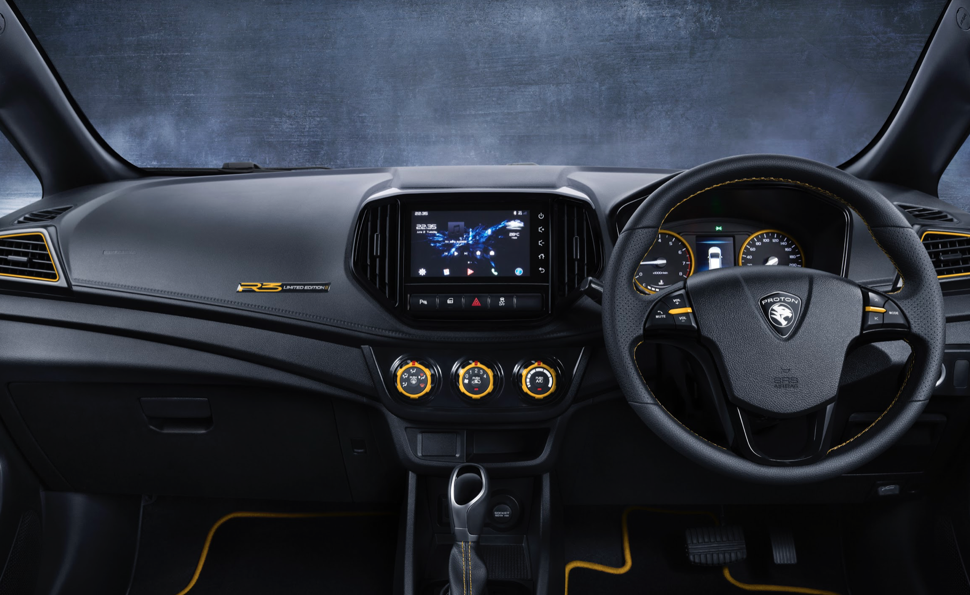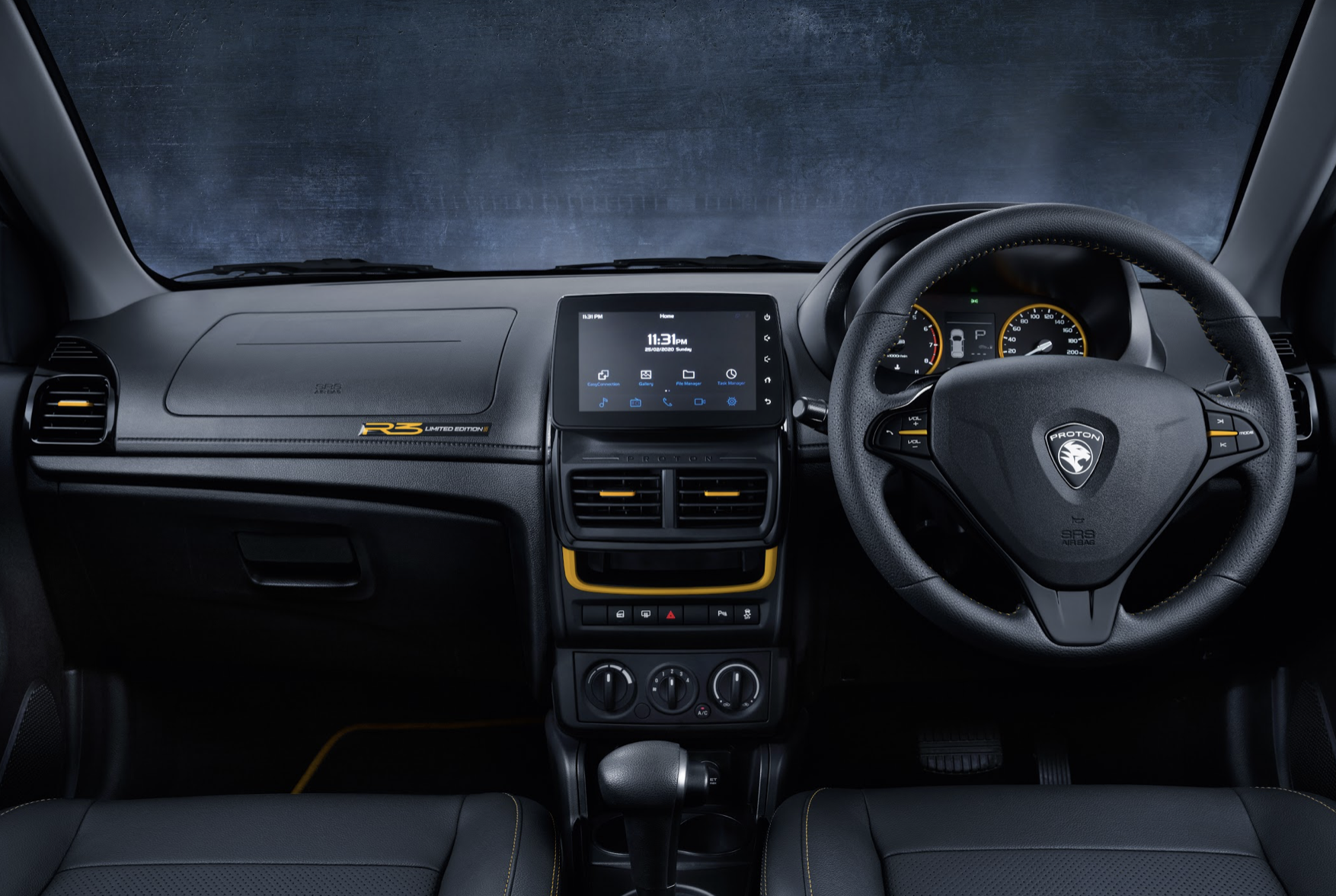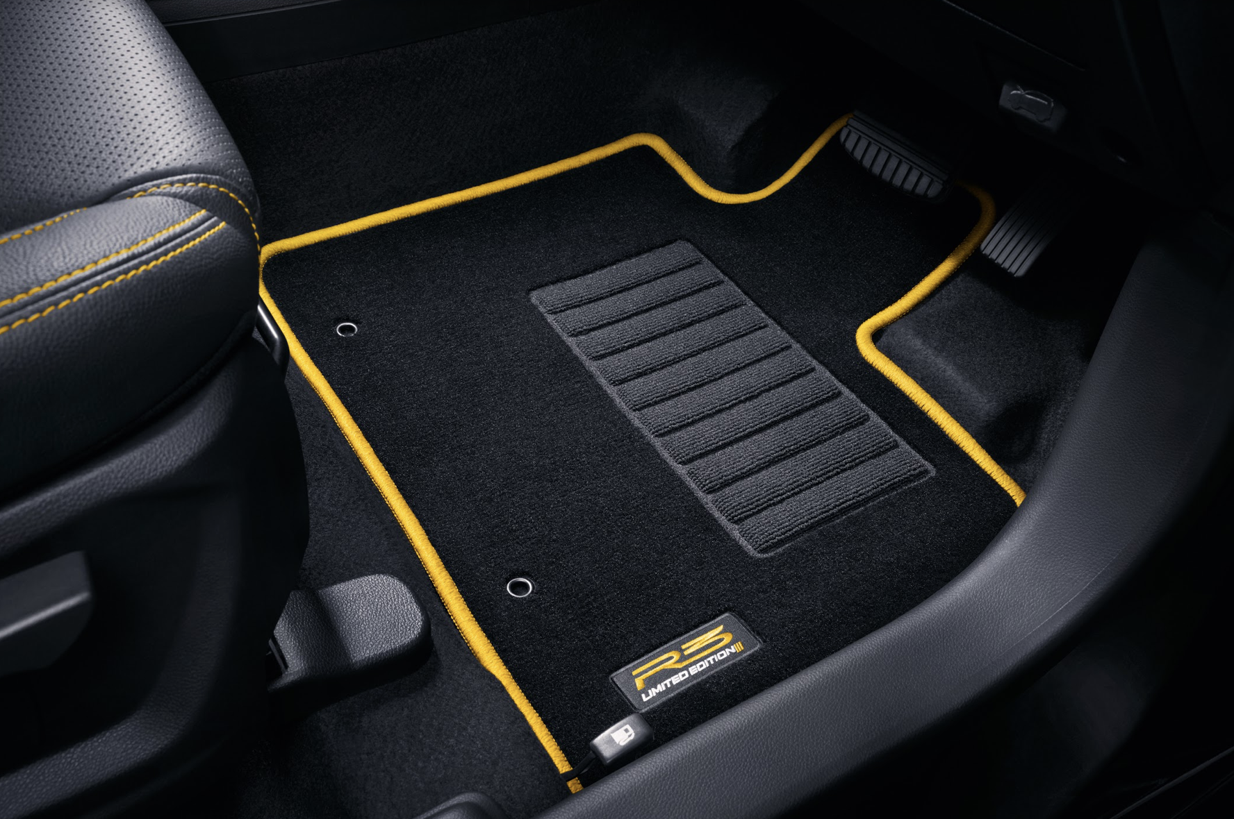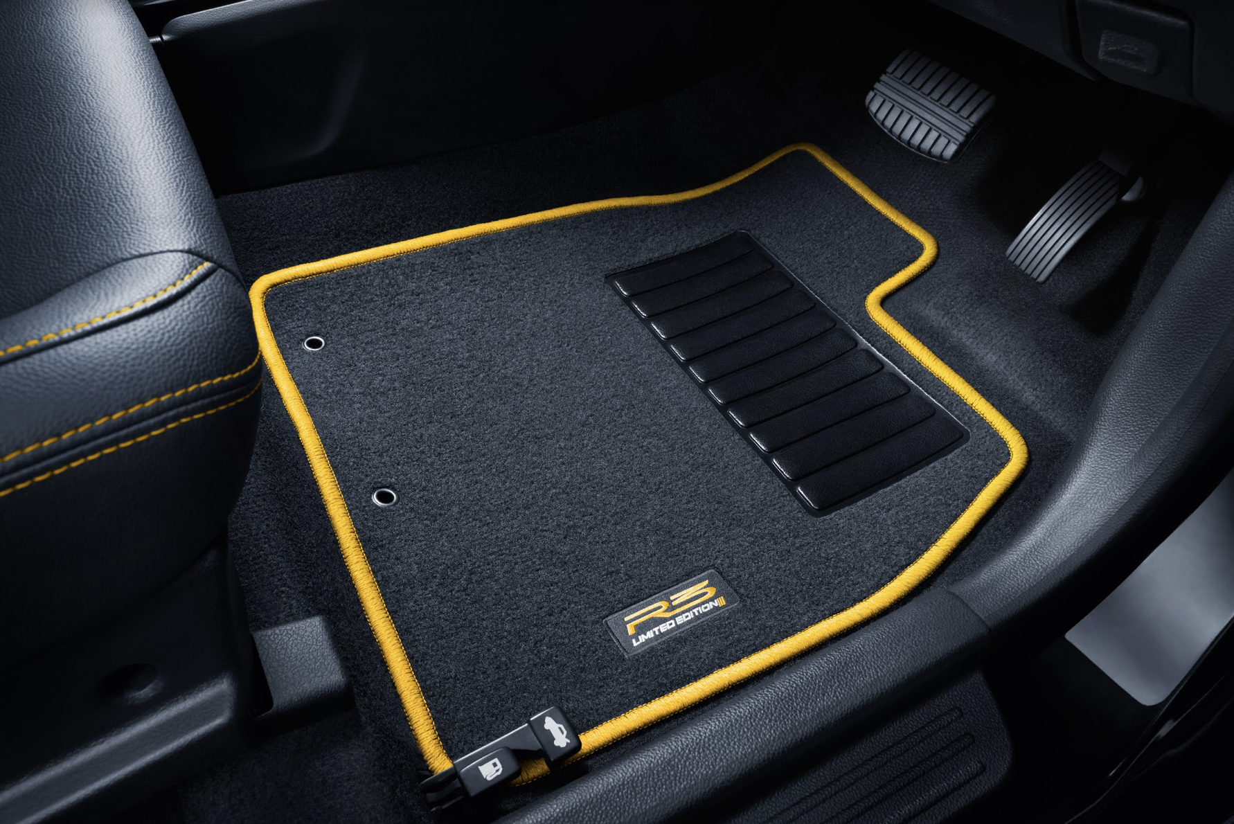 这两部车款也是使用黑色车漆,加上亮眼的 R3 标志,是 Proton 赛车上使用的同样标志。Proton Iriz 配上 16 吋 R3 合金轮辋,而 Saga 采用 15 吋合金轮辋以灰色装饰。运动风格的 R3 车身配饰在外,车舱则是以独特的黑黄色作为主调,皮革座椅和 R3 地毯,呈现整体的运动风格。