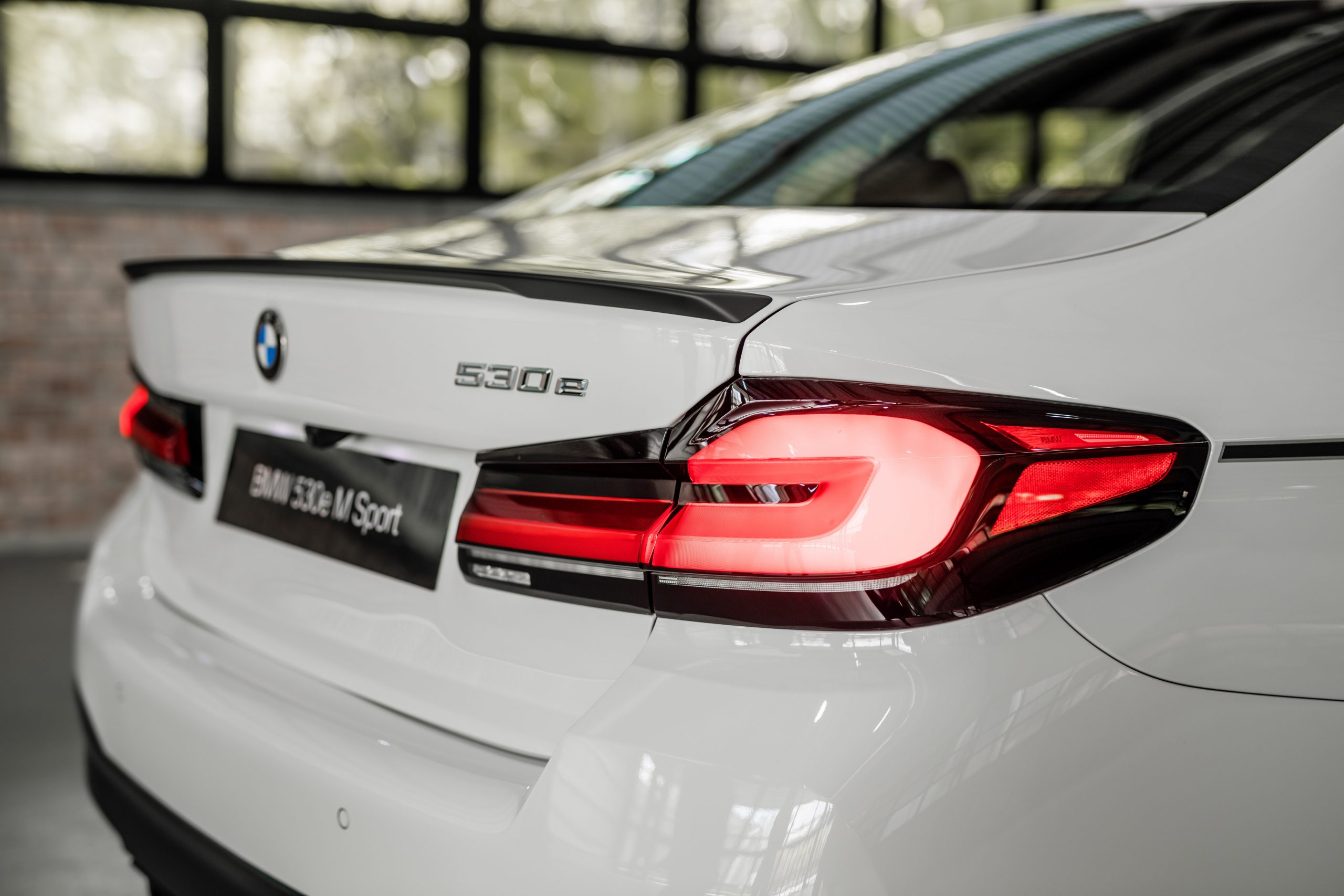 新 BMW 530e M Sport 搭载了 BMW 个性化钢烤阴影线(BMW Individual high-gloss Shadow Line),新 BMW 530i M Sport 则搭载了 BMW 个性化雾银色泽外观线(BMW Individual Exterior Line Aluminium Satinated)。这两款改版车的前与后防撞杆进气口也已重新设计成更大型,且紧靠著招牌 BMW L 形新 LED 尾灯。灯源有史以来第一次被直接整合到了尾灯的最外层,从而最大化了立体效果。