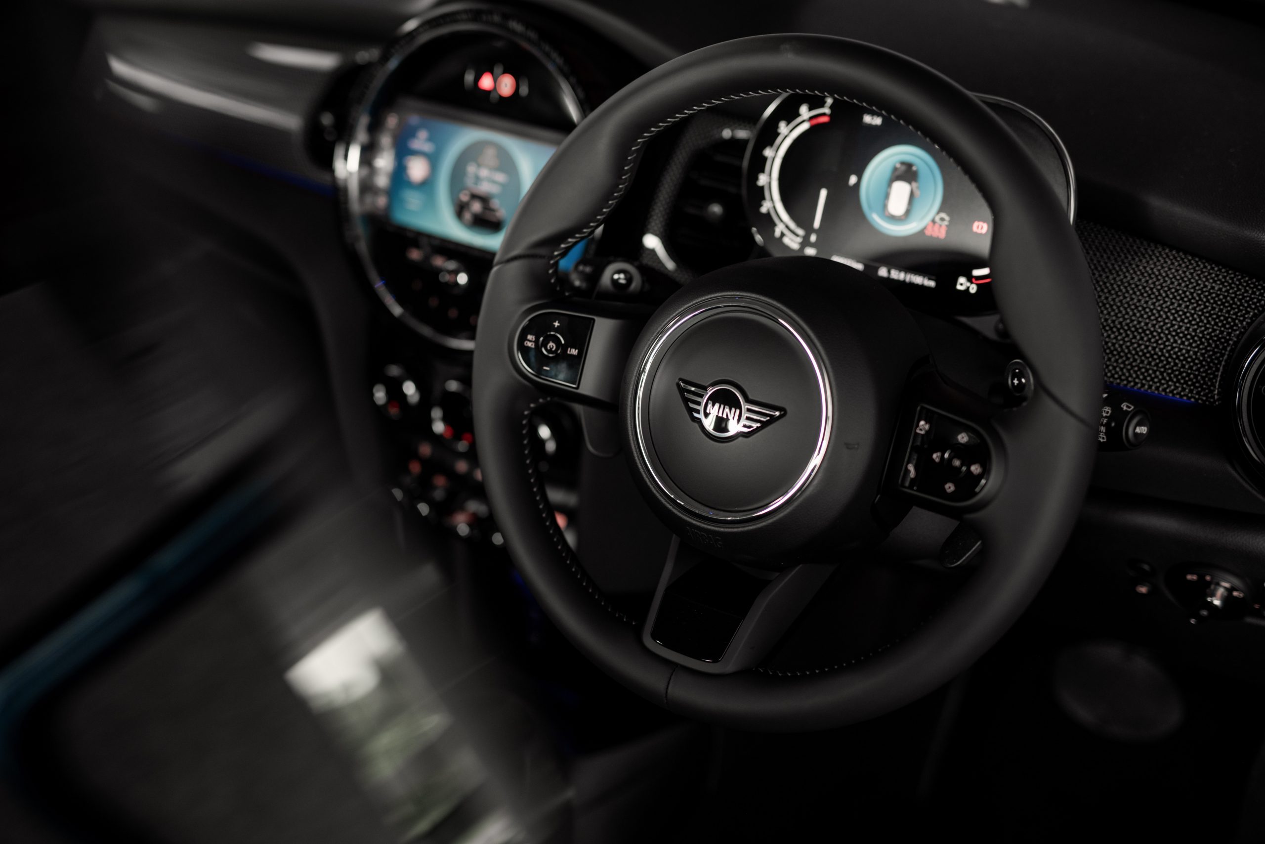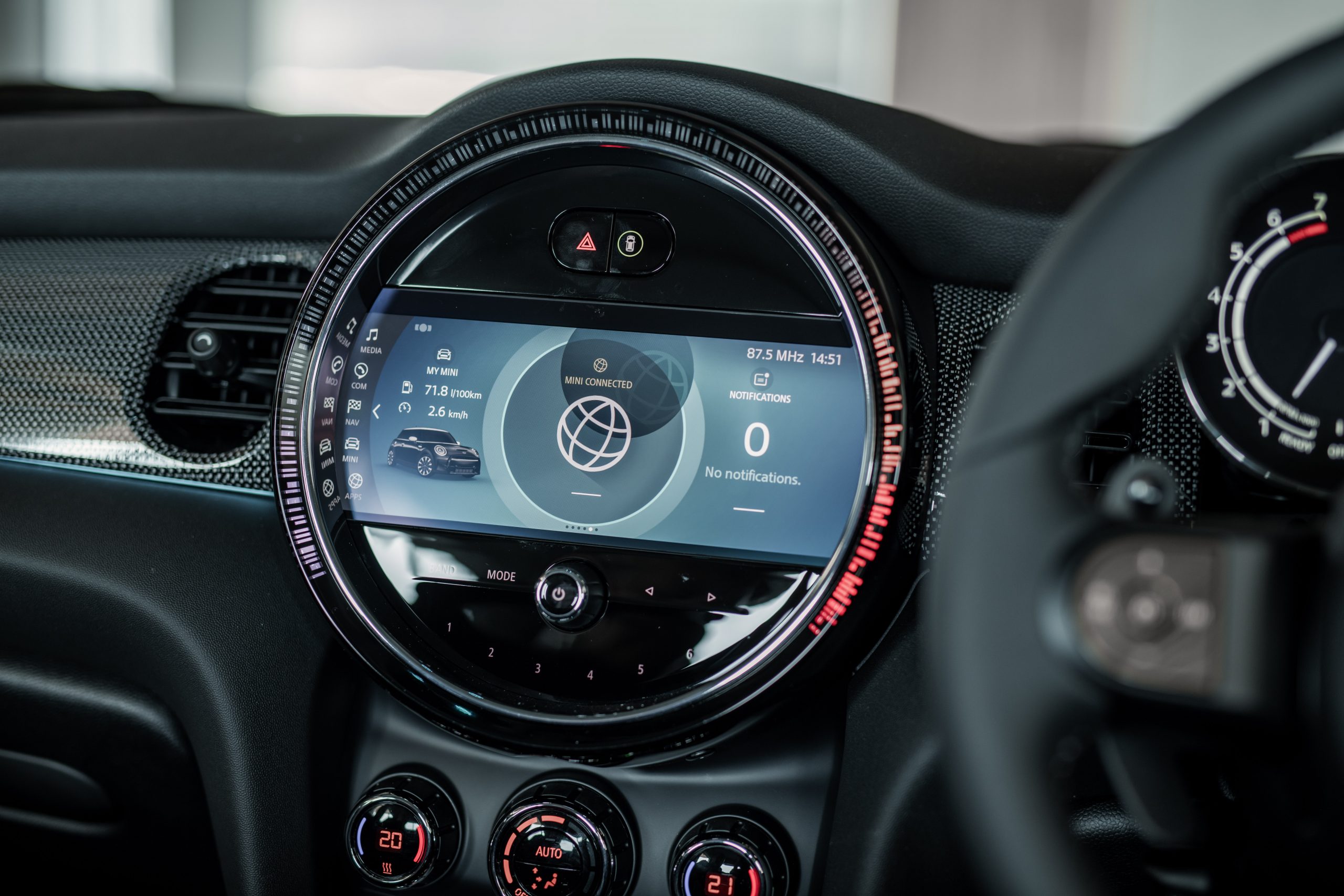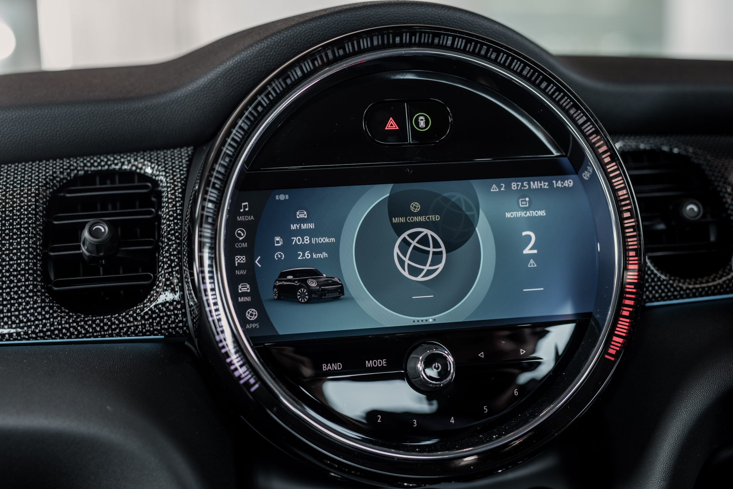 新高光泽钢琴黑环绕的新一代中央仪表群也搭载内建了导航及 Apple CarPlay 的 8.8 吋萤幕,这些新 MINI 车款还标配了现代化图像。也应用了黑色面板技术的 5 吋彩色萤幕的新数码仪表群能显示所有相关驾驶资讯,它还内建了可配置式现场界面工具集以及两种色系:Lounge 与 Sport。这些新 MINI 车款还搭载了 6 色环舱气氛灯,进一步突显了它们让人耳目一新的车内氛围。