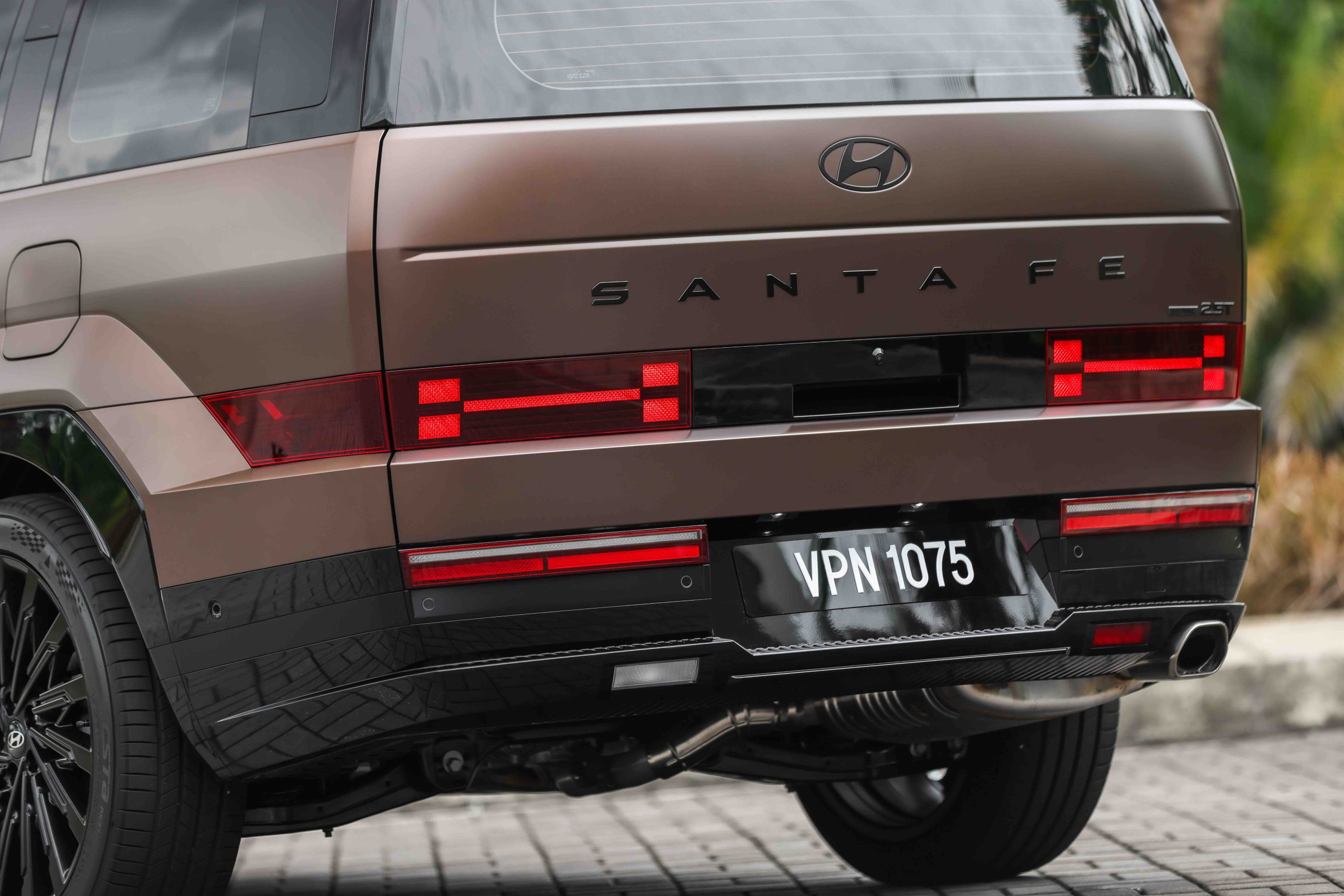 外观上,Santa Fe 采用更为方正且具有视觉张力的设计语彙。车头与尾部大量 H 型元素呼应家族语言,方正的线条与宽大的轮拱让它在道路上极具存在感。